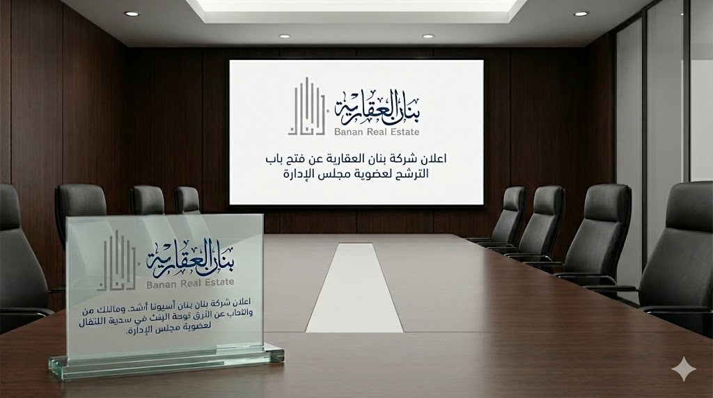 مقدمة يسر شركة بنان العقارية أن تعلن لمساهميها الكرام، عن فتح باب الترشيح لعضوية مجلس إدارة الشركة للدورة الجديدة التي تبدأ أعمالها اعتباراً من 26 ديسمبر 2025م وتنتهي في 25 ديسمبر 2028م (لمدة ثلاث سنوات).